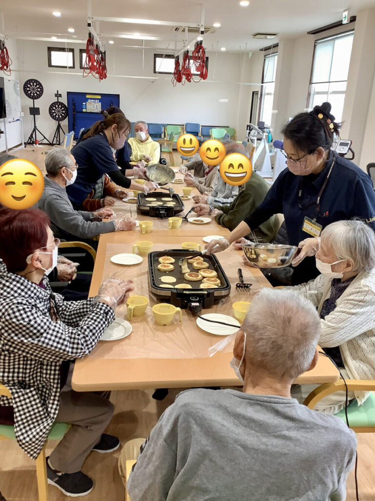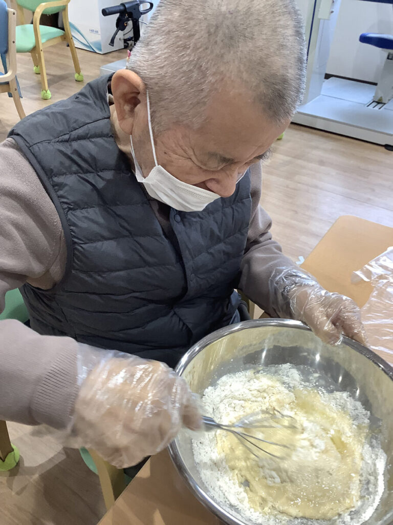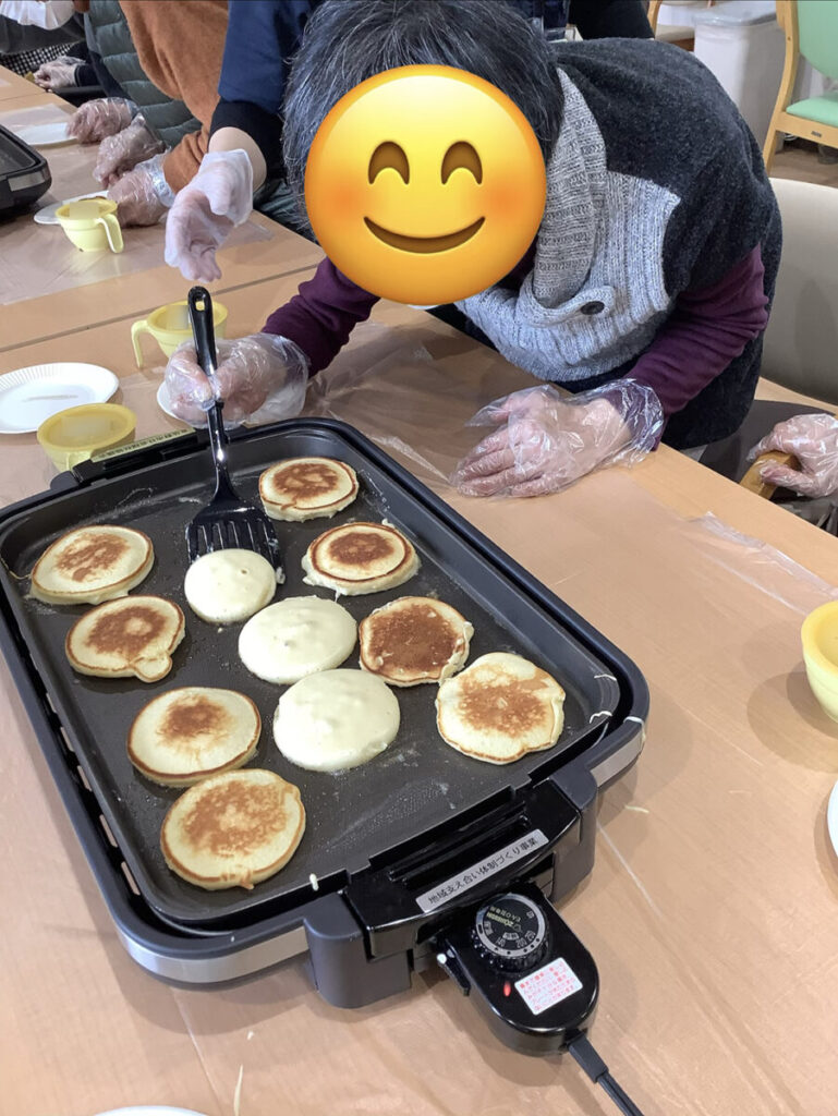 ボウルを混ぜる動作や、生地を流す・ひっくり返す工程は、楽しみながら手指や腕を動かすリハビリにもつながっています。