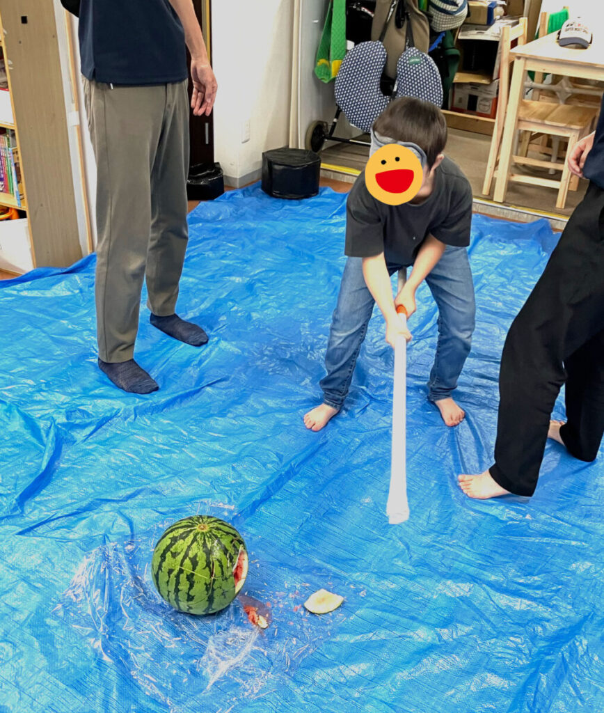 夏の風物詩のひとつであるスイカを使って、室内でスイカ割をしました。