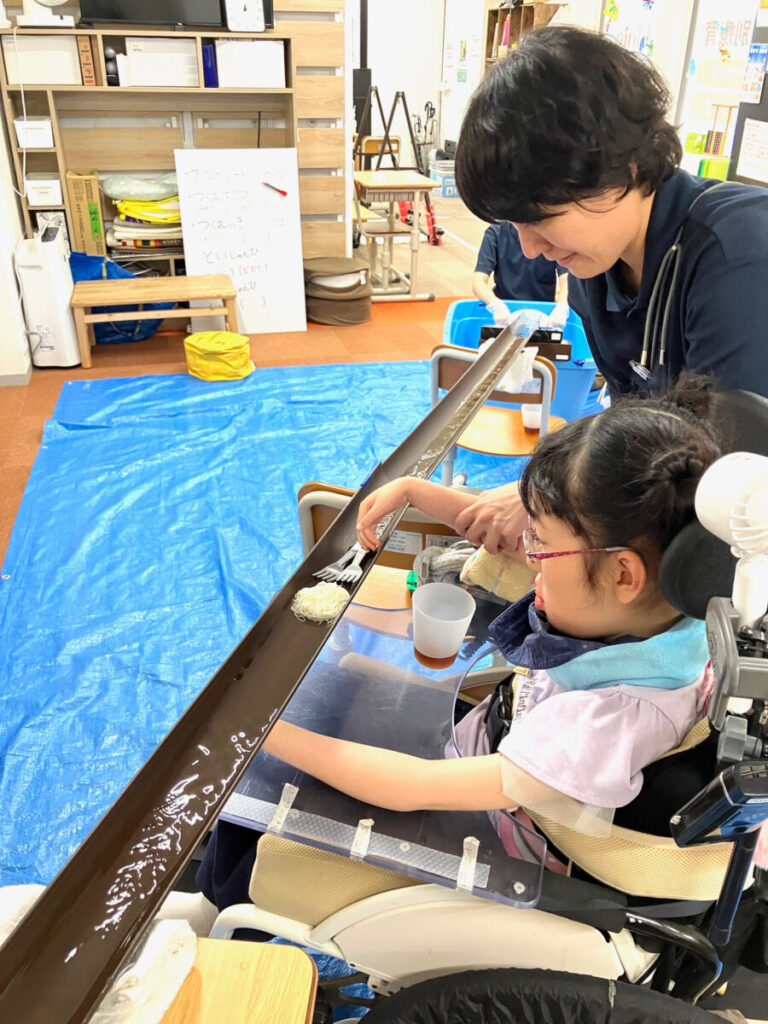 雨といの幅いっぱいにフォークがわたるようにし、スタッフの補助の元すくうなど、それぞれ子どもたちの能力に合わせた楽しみ方を調整しました。