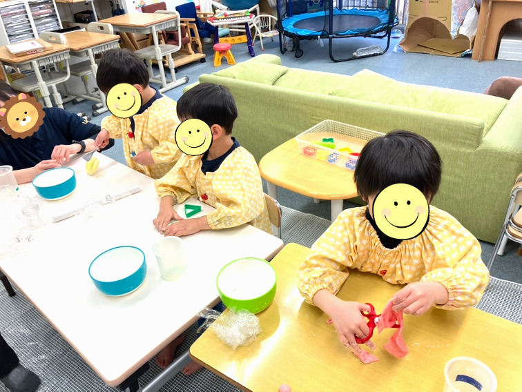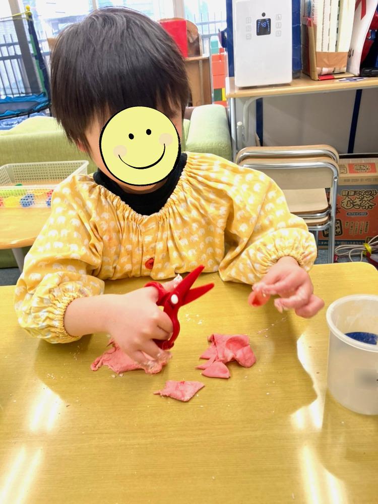 完成した粘土では、丸める・形を作る・ハサミで切るなど、手先の動きをたくさん使いながら遊びました。