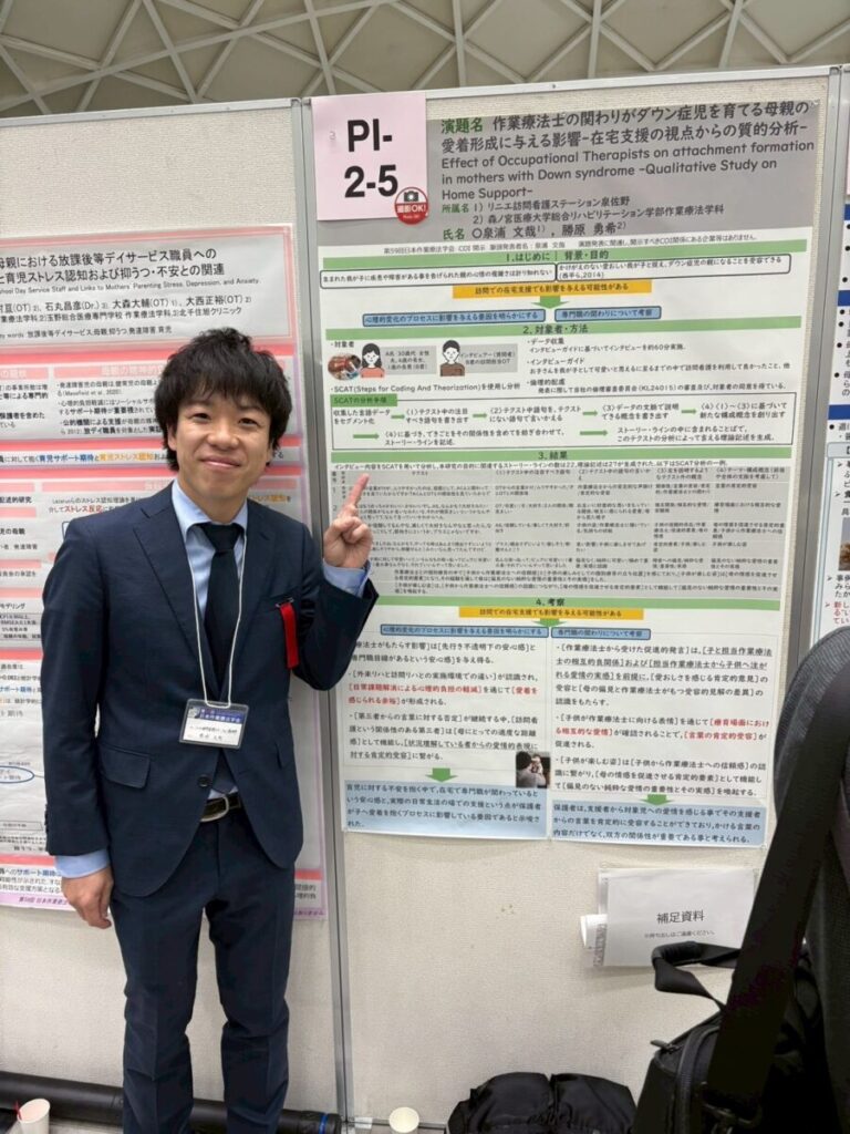 | 発達障害 | 作業療法士の関わりがダウン症児を育てる母親の愛着形成に与える影響〜在宅支援の視点からの質的分析〜 | リニエ訪問看護ステーション泉佐野 泉浦文哉 |