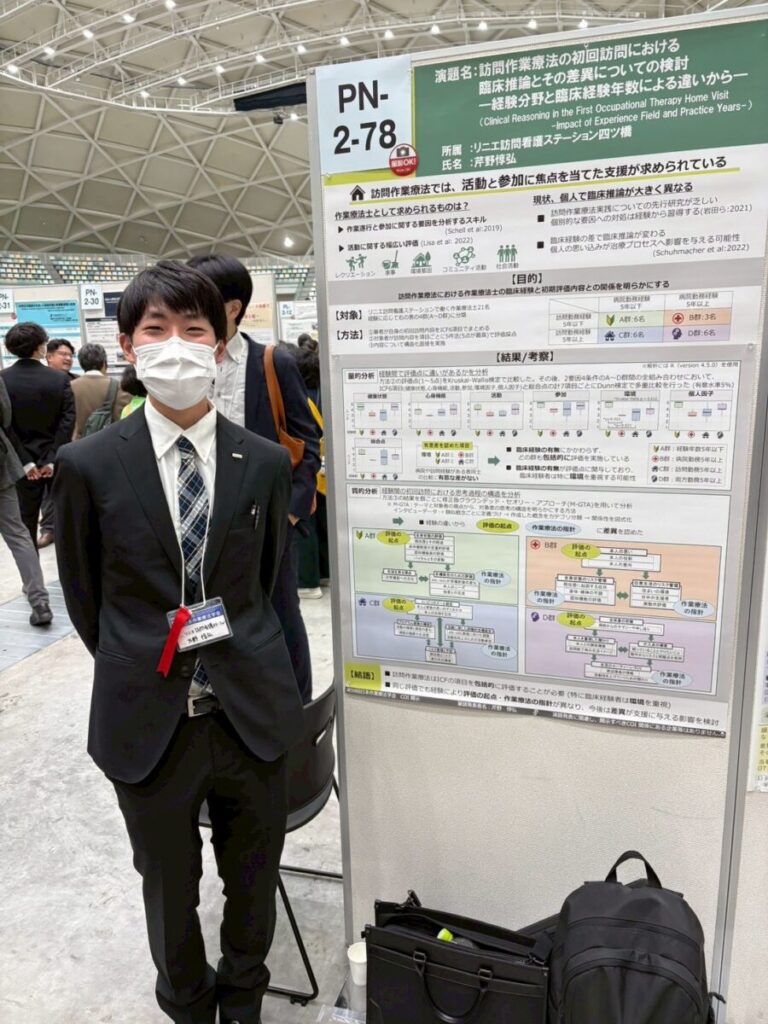 | 地域 | 訪問作業療法の初回訪問における臨床推論とその差異についての検討〜経験分野と臨床経験年数による違いから〜 | リニエ訪問看護ステーション四ツ橋 芹野惇弘 |
