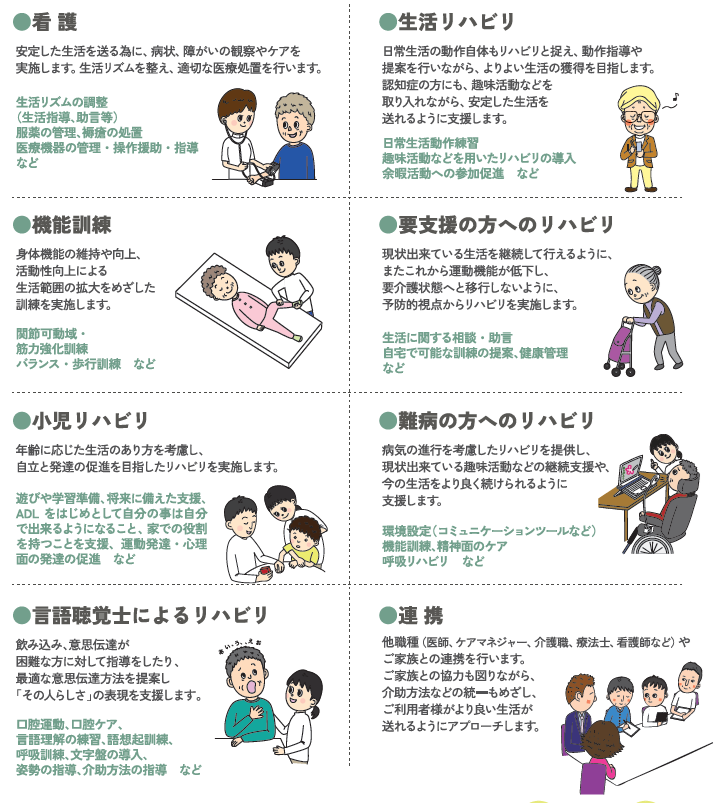 当事業所では看護師と療法士が協働し、地域の関係機関の皆様と連携・協力しながら、利用者様お一人おひとりに最適なサービスを行い、在宅生活を支援していく事を体制つにしています。