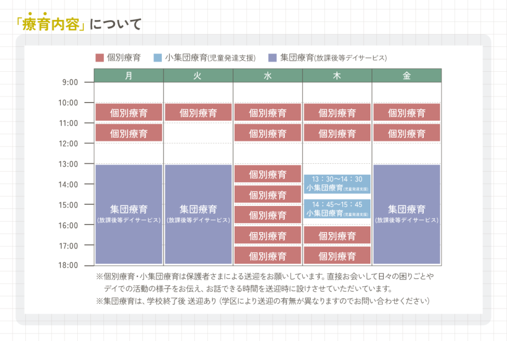 保育士・児童指導員・作業療法士・言語聴覚士が連携し、お子さまの発達段階に応じた課題にアプローチします。
